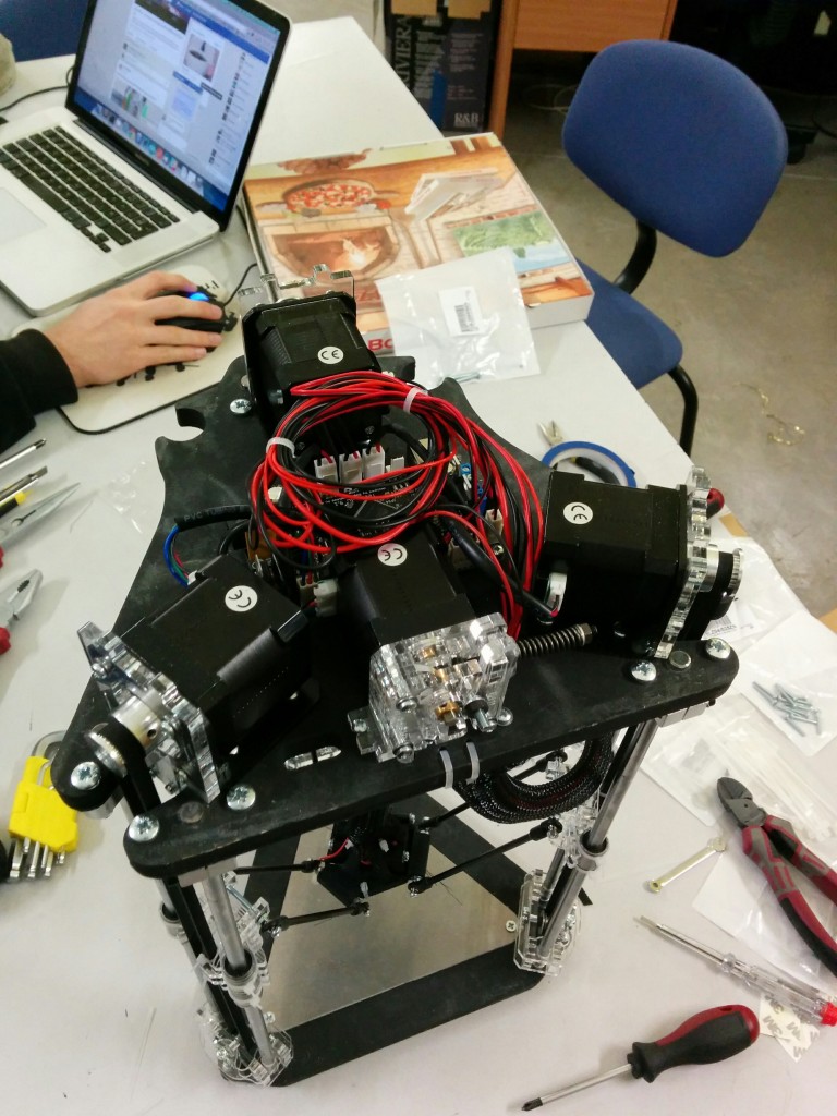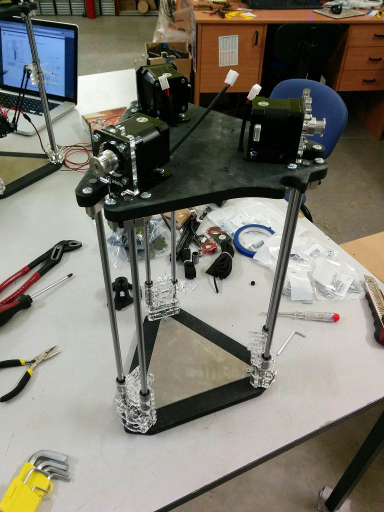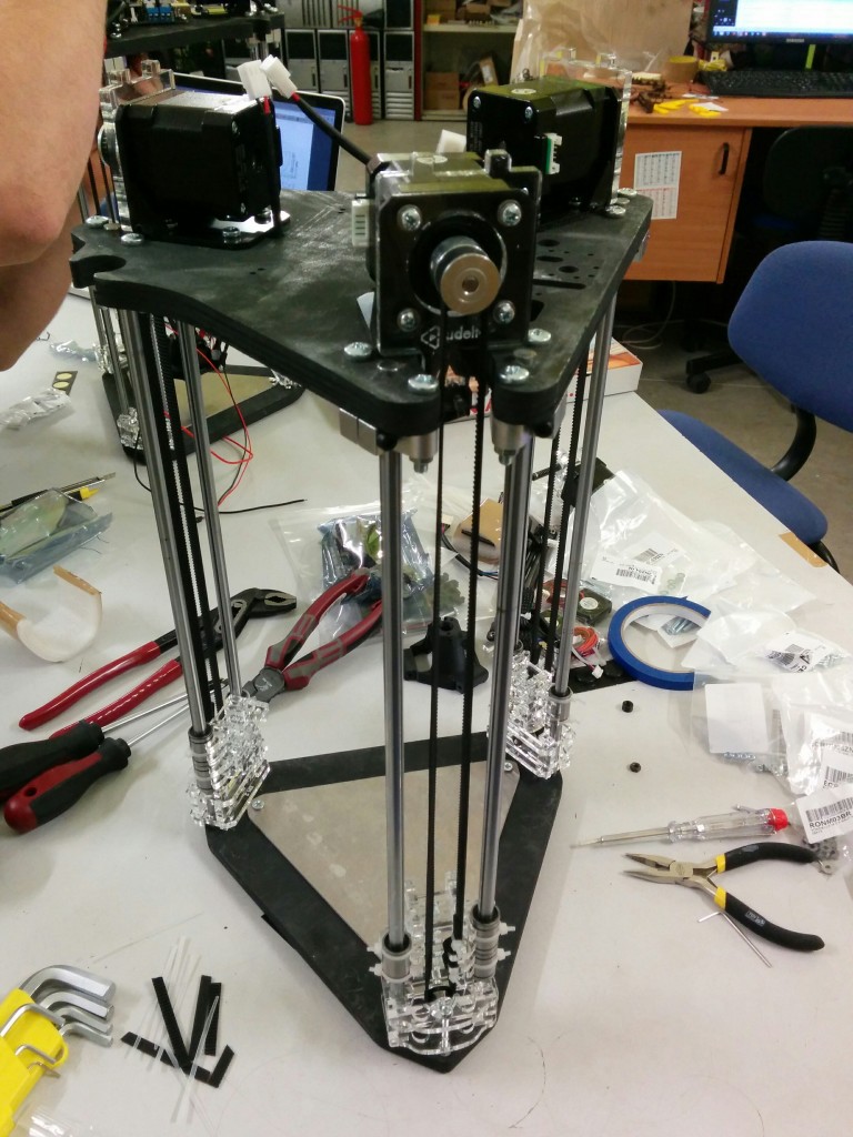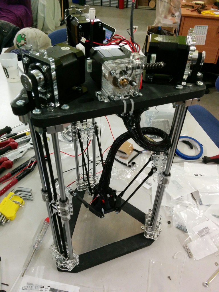 Pour le montage des biellettes sur le noyau, il manque un détail important (je me suis fait avoir). lors du montage il faut que le noyau soit au dessous du niveau des tendeurs. (simplifié : le noyau en bas, et les tendeurs au dessus du noyaux). Si on fait l’inverse (ce que j’ai fait) on se retrouve avec le noyau (la buse, etc) au dessus des tendeurs et donc impossible d’atteindre le plateau d’impression.