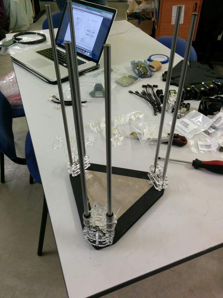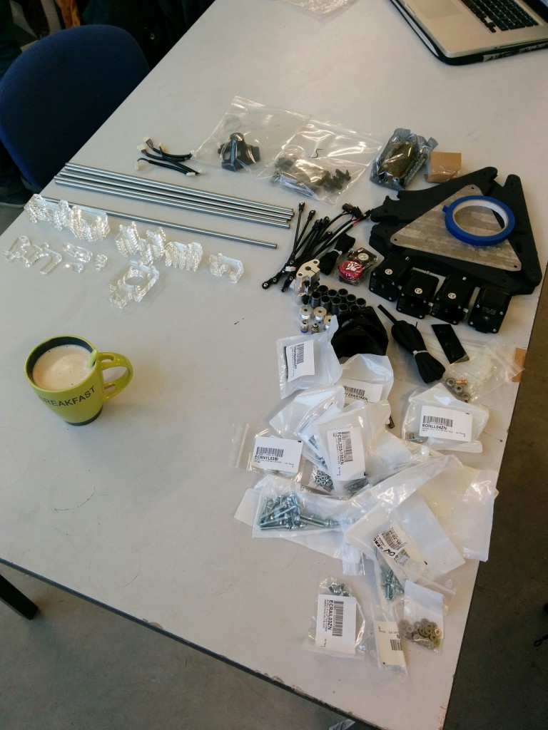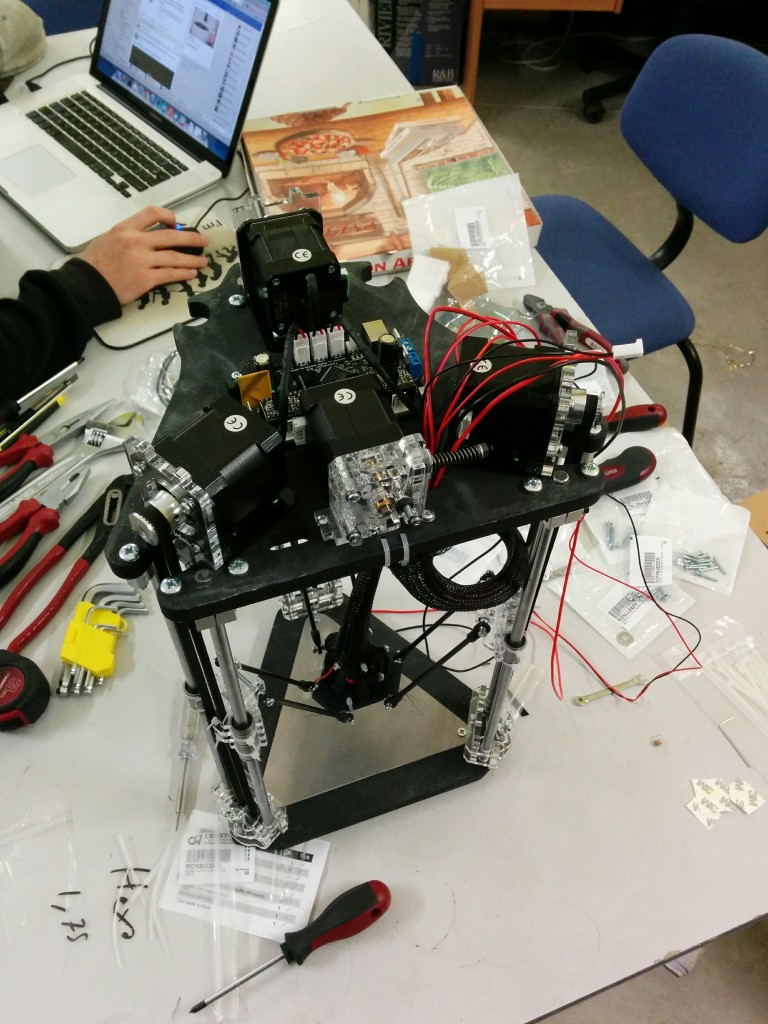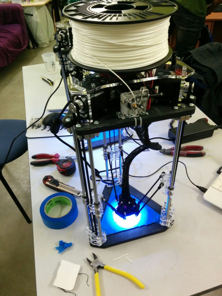 Pour le montage des biellettes sur le noyau, il manque un détail important (je me suis fait avoir). lors du montage il faut que le noyau soit au dessous du niveau des tendeurs. (simplifié : le noyau en bas, et les tendeurs au dessus du noyaux). Si on fait l’inverse (ce que j’ai fait) on se retrouve avec le noyau (la buse, etc) au dessus des tendeurs et donc impossible d’atteindre le plateau d’impression.