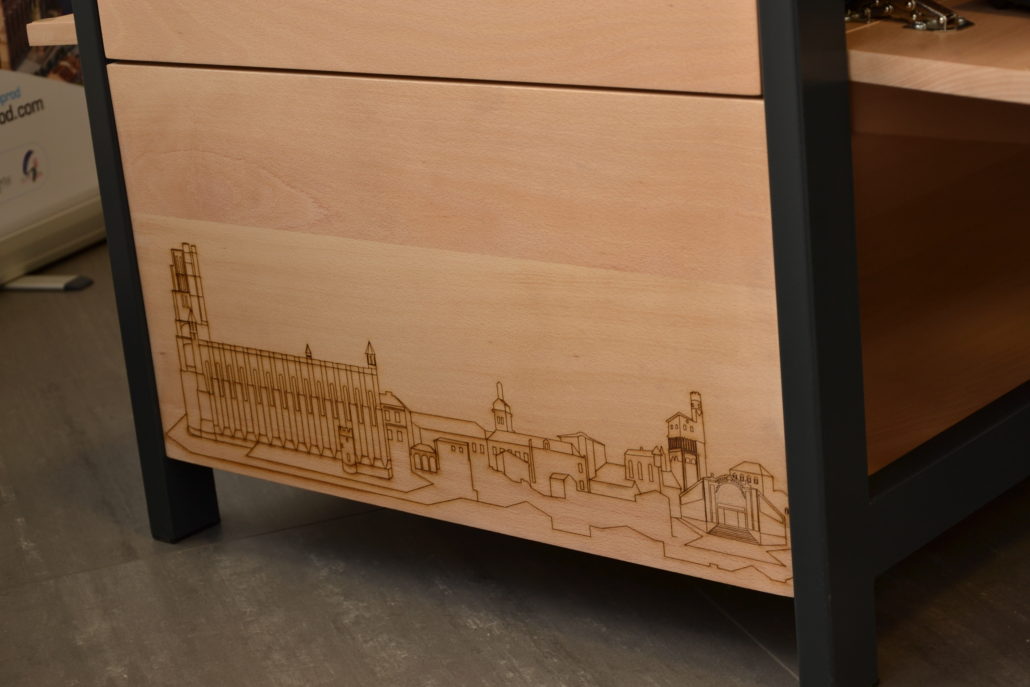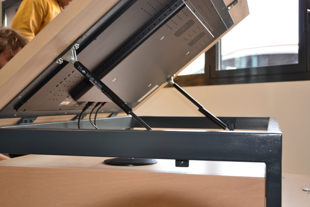 La table tactile a été pensée et conçue au Fablab et a bénéficié de nos outils de personnalisation. On y voit par exemple des gravures réalisées à l’aide de la découpeuse laser et le logo de la ville ajouté à la brodeuse numérique.