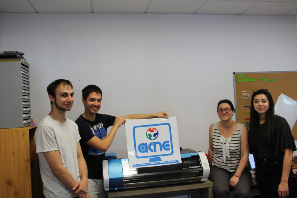 Voici le premier essai effectué avec l’imprimante, et oui c’est le logo de l’association présenté par quelques membres du Fab Lab.